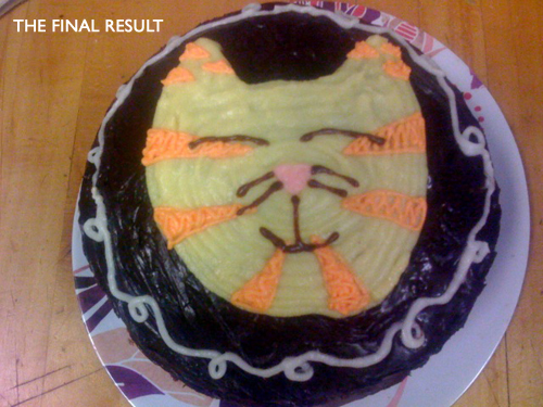 That is the prettiest cake I have ever seen, and though it looks really yummy I imagine it must’ve been a painful task to cut it and deface the poor cat…