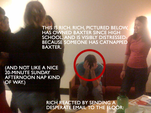 And so, boy and cat were united once again, and Rich cried no longer. “When I first walked into my room on that fateful day,” quoth Rich, holding Baxter protectively in his arms, “I instantly felt that something was wrong. Losing Baxter was like losing your best friend, someone who’s always there for you. A part of me felt missing, at least Pi/3 radians of my heart…It’s great to have him back home, and I would like to thank everyone who helped in the effort to find him.”