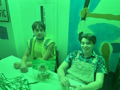 A head-and-shoulders illustration of Anika. They have light skin, medium-length brown hair with bangs, and are wearing a teal shirt with a red bandana, making a peace sign with their left hand.