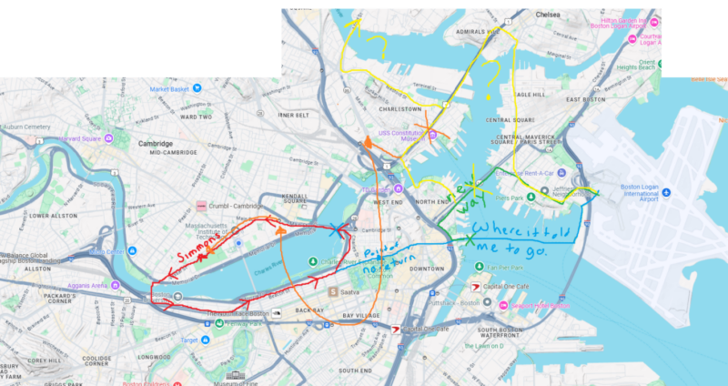 There isn’t a bridge from the mainland to the island that Boston Logan Airport is on. The line on Google Maps was a ferry it wanted me to take. But take a boat just to take a train back? I might as well just run home and keep running! So that’s what I did. Until I looked at my map again: