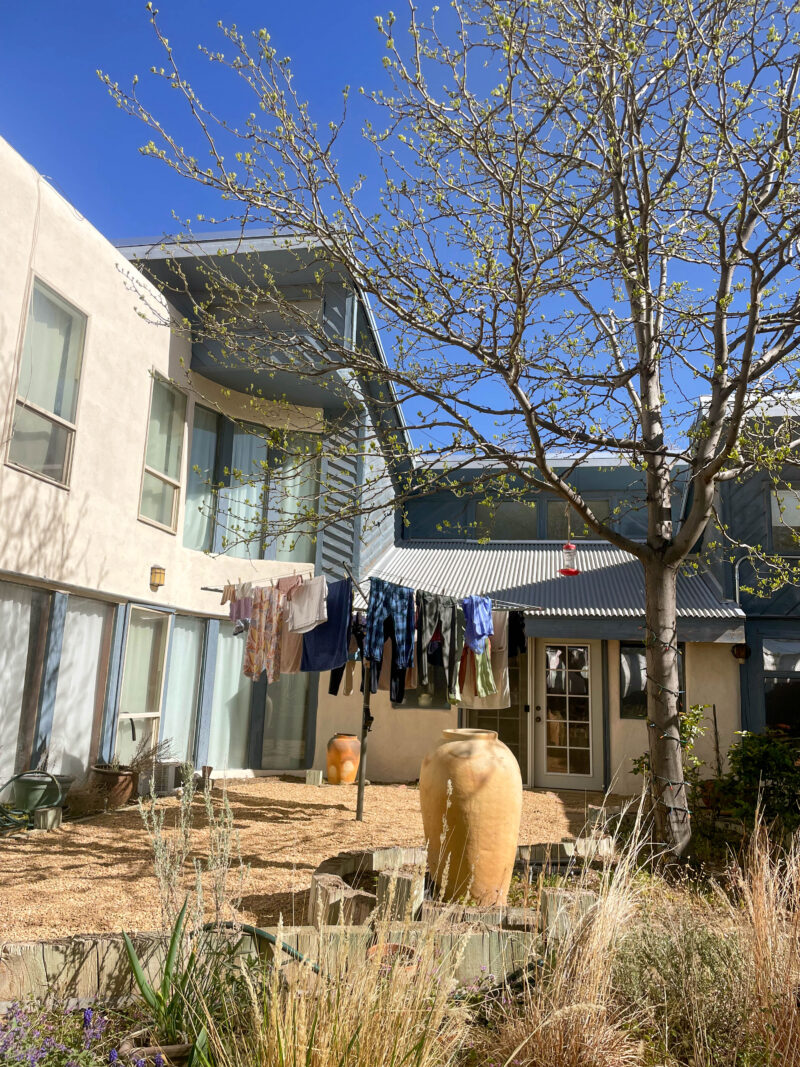 After the wedding, we moved to Albuquerque, to a funny house shaped like a ‘U.’ The bowl of the U made a kind of informal courtyard, surrounded by the white sides of the house and by the crumbling adobe brick wall that separated us from the gravel road. We set up an outdoor dining table and a pottery wheel in the shade of big elm trees, and when it wasn’t too blistering hot or freezing cold (Albuquerque is a land of extremes) we spent days out there, and sat around with friends in the afternoon.
